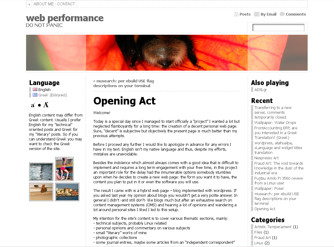 This change wasn’t easy though. I had to make the theme xLanguage (multilingual) compatible, to fix an issue with international characters, to add some rss icons (borrowed from Atahualpa) and make some adjustments in the css file. So, although I know nothing of php, css and xhtml, I managed somehow to tamper with code in all these languages and make the theme work better than the original. Also I had to find new plug-ins, translate and adjust them too to my needs. Last I had to create two new logos (one English and one Greek), a favicon, seriously reorganize my categories and add thumbnails to my posts.